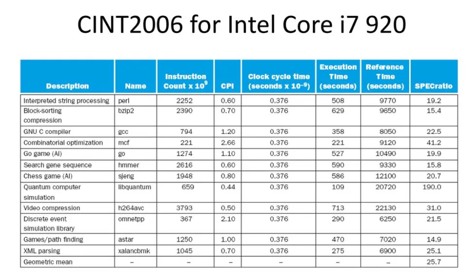그래서 결과적으로 맨 마지막에 나와있는 SPECratio를 gemetric mean구하여 기존 reference machine에 비해 얼마나 성능이 좋은지 표현. 이 표에선 25.7배 빠르다고 할 수 있겠다.