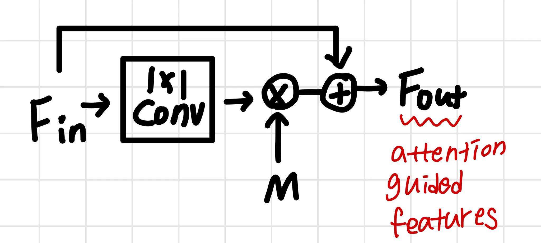 이 masks는 transformed local features인 ( 1x1 conv 이후에 얻어진 ) 을 re-calibrate(재보정)하기 위해 사용된다. 이는 identity mapping path에 추가되는 attention guided features를 결과물로 산출한다.