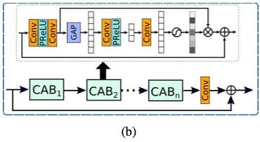ORB(original resolution block)의 구조와 CAB의 구조를 나타냄