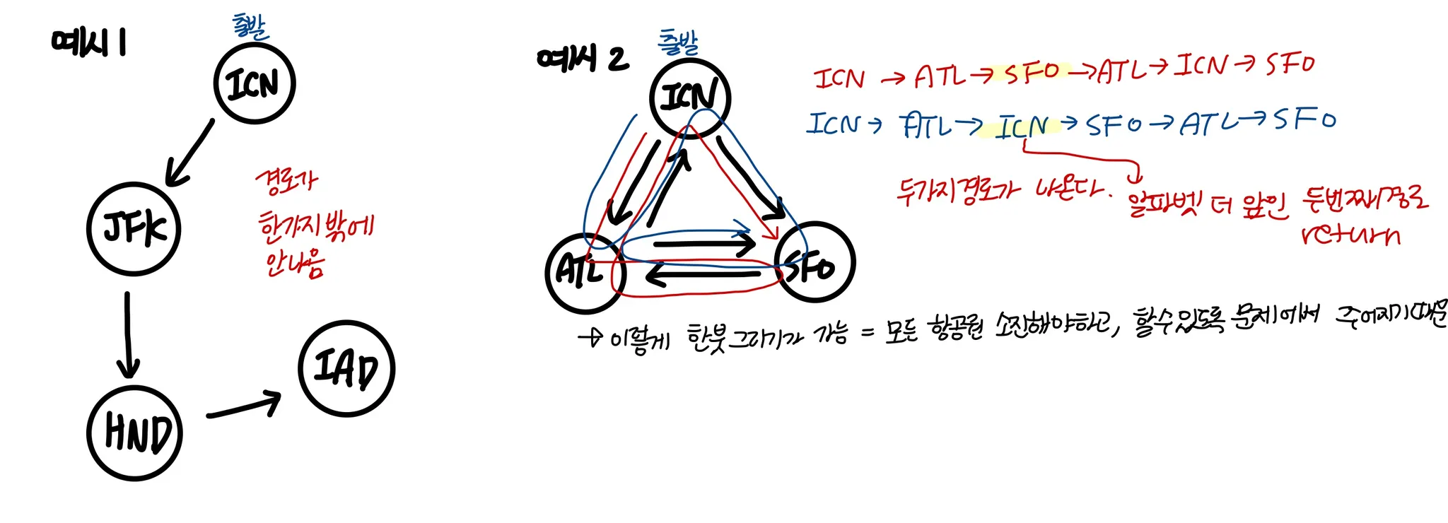 항공권 사용 순서를 결정해야 하는 것인데, 한 정점에서 선택할 수 있는 간선이 2개 이상이라면 공항 알파벳 순서를 따르면 될 것입니다(문제의 조건)