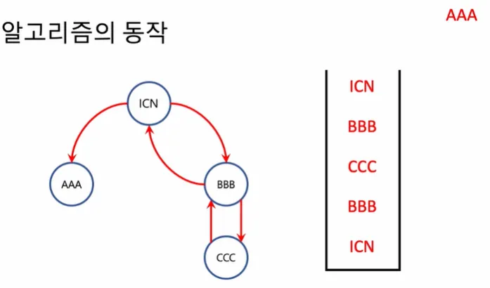 다음과 같은 예시에서, 출발지는 항상 ICN이므로 stack에는 ICN이 일단 들어있습니다.