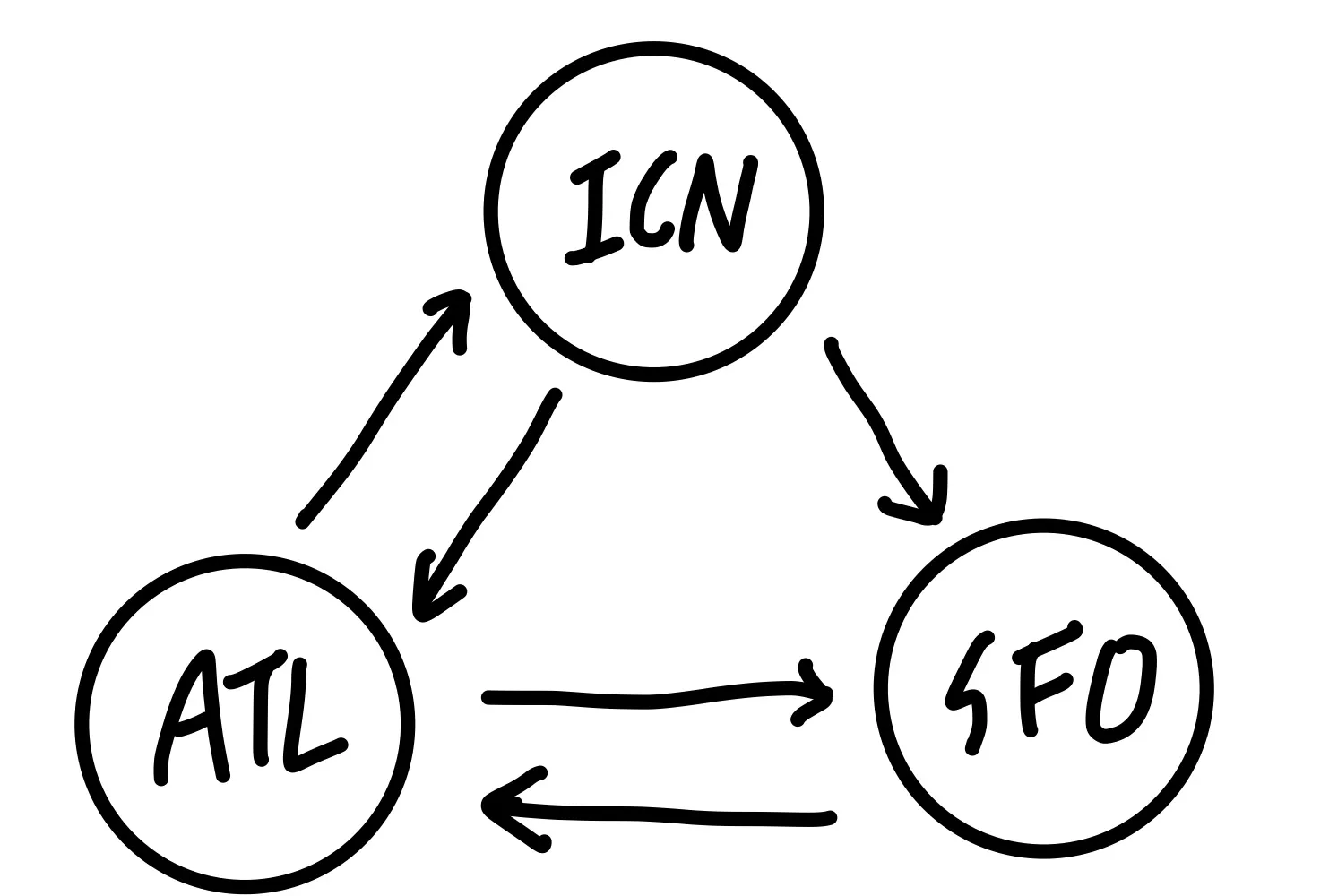 ATL에서는 ICN으로 되돌아가는 방법과 SFO로 가는 방법이 있네요 ICN이 알파벳에서 더 앞서니 다시 돌아가줍시다 : ICN - ATL - ICN