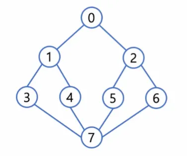 마지막 남은 노드인 6을 방문하며 깊이 우선 탐색을 끝낸다. : 0 - 1 - 3 - 7 - 4 - 5- 2- 6 → 예시를 보면 알겠지만 유일한 방문 순서는 아님