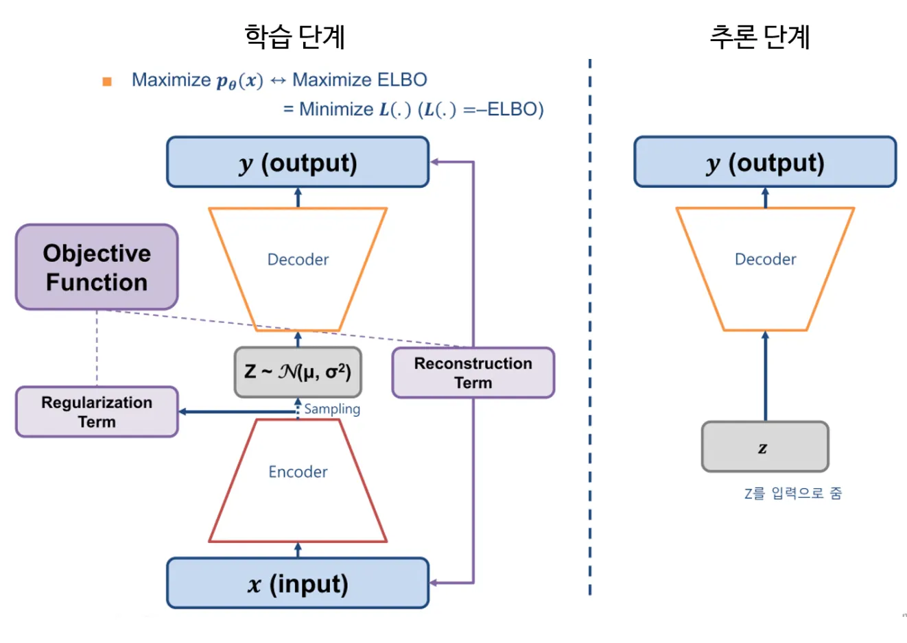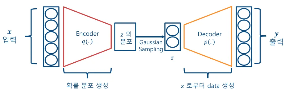 따라서 VAE는 위의 그림처럼 encoder에서 학습한 데이터의 분포 (의 분포)로부터 samping한 를 decoder의 입력으로 사용해 decoder는 로부터 데이터를 생성한다.