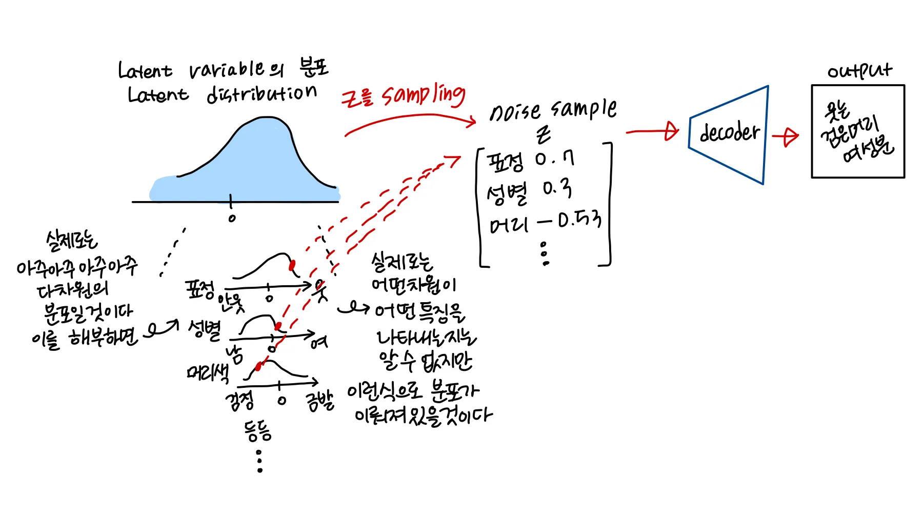 sampling된 는 매우 다차원의 Latent distribution에서 어떠한 특징에 대한 값을 갖고 있는 vector가 된다. sampling된 가 decoder로 들어가게되면 그림처럼 해당하는 feature에 대한 결과물이 output으로 나오게 된다.