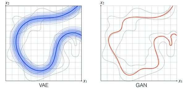 위 이미지에서 회색으로 표시된 실선이 실제 이미지의 분포이다. 파란 부분이 VAE가 예측한 분포, 빨간 선이 GAN이 예측한 분포이다.