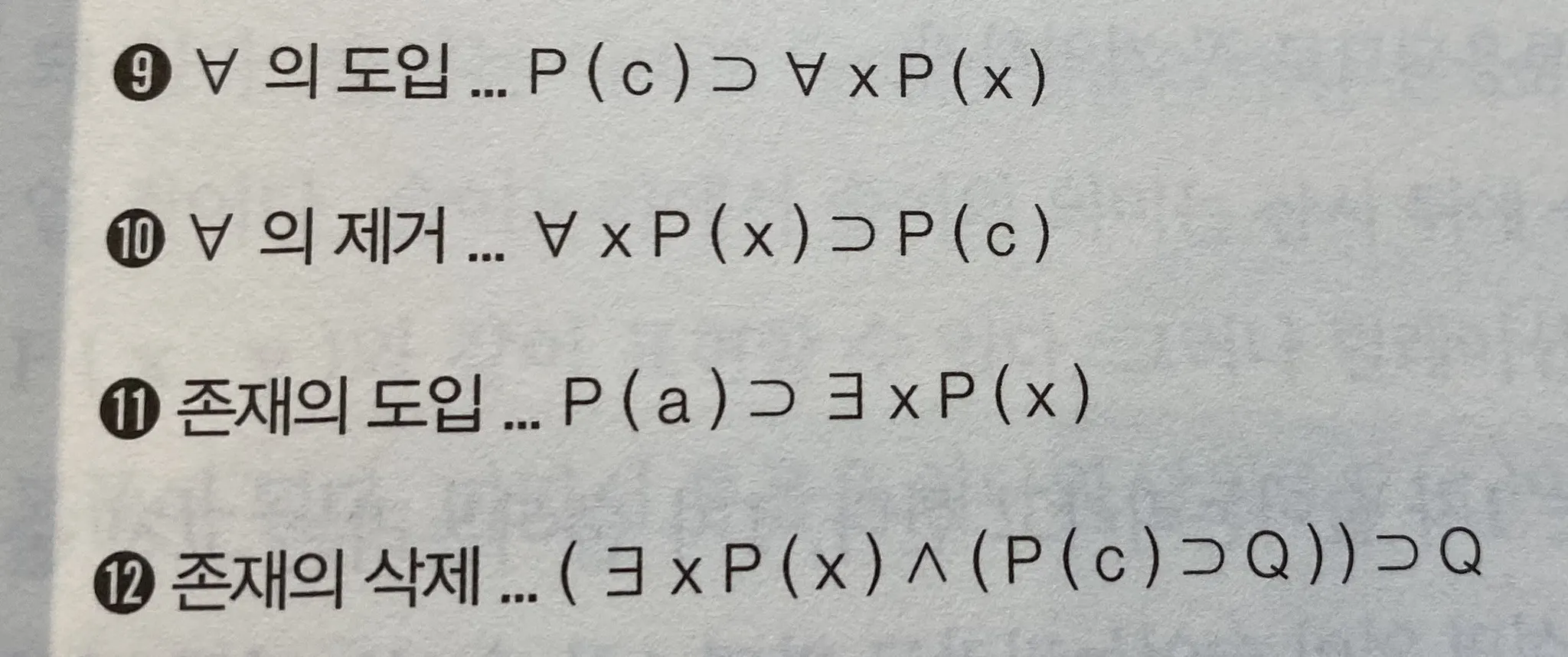 12: ∃ x P(x)라는 전제에 임의의 값 c에 대해 P(c) ⊃ Q라는 보편적 법칙이 성립한다면 Q라는 명제는 참이다.