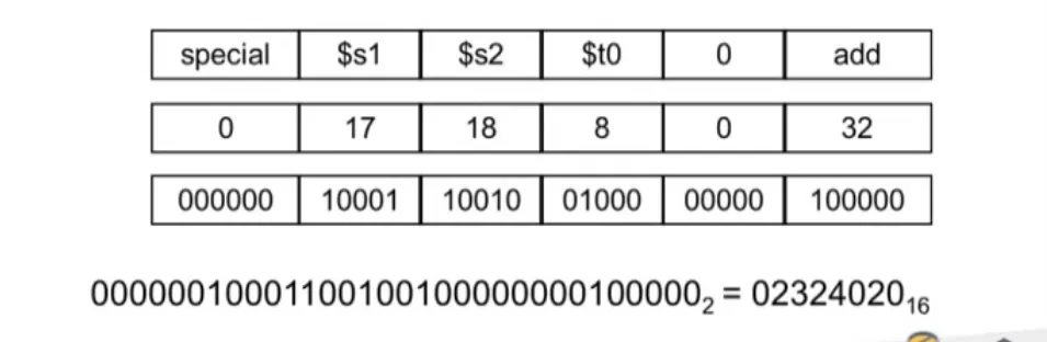 ⇒ 즉, 명령어로 000000 10001 10010 01000 00000 100000 이 코드를 만나면 add $t0, $s1, $s2 연산을 실행한다 . machine code